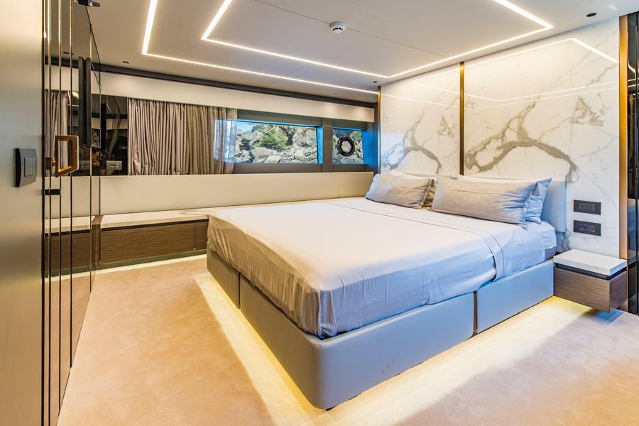 Inside, the 70 m² interior offers ultimate comfort. It features high-end materials such as Calacatta marble in the cabins and black marble in the bathrooms. The yacht also has an active stability system with a carbon fin. This system reduces seasickness and provides smooth sailing. Whether relaxing or socializing, the interior offers a luxurious setting.